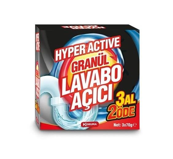 - En Güçlü Lavabo Açıcı ile Sorunlar Geride Kalsın! Hyper Active Granül Lavabo Açıcı 3x70Gr ile lavabo tıkanıklıkları artık kabus olmaktan çıkıyor. Bu güçlü ve etkili formül, lavabonun suyunu hızla akıtacak ve sizi tıkanıklık endişesinden kurtaracak. Hyper Active Lavabo Açıcı lavabo borularında etkili bir şekilde etki ederken, kötü kokuları da anında ortadan kaldırıyor. Artık lavabo tıkanıklığı yüzünden yaşanan rahatsızlıklar ve beklemeler tarih olacak! Pratik kullanımı sayesinde sadece birkaç adımda lavabo tıkanıklıklarını unutacaksınız. Evinizin ve yaşam alanlarınızın rahatlığını ve hijyenini bu etkili ürünle güvence altına alın. Artık tıkanıklık sizi yavaşlatmasın, Hyper Active ile hareketli bir yaşamın tadını çıkarın!