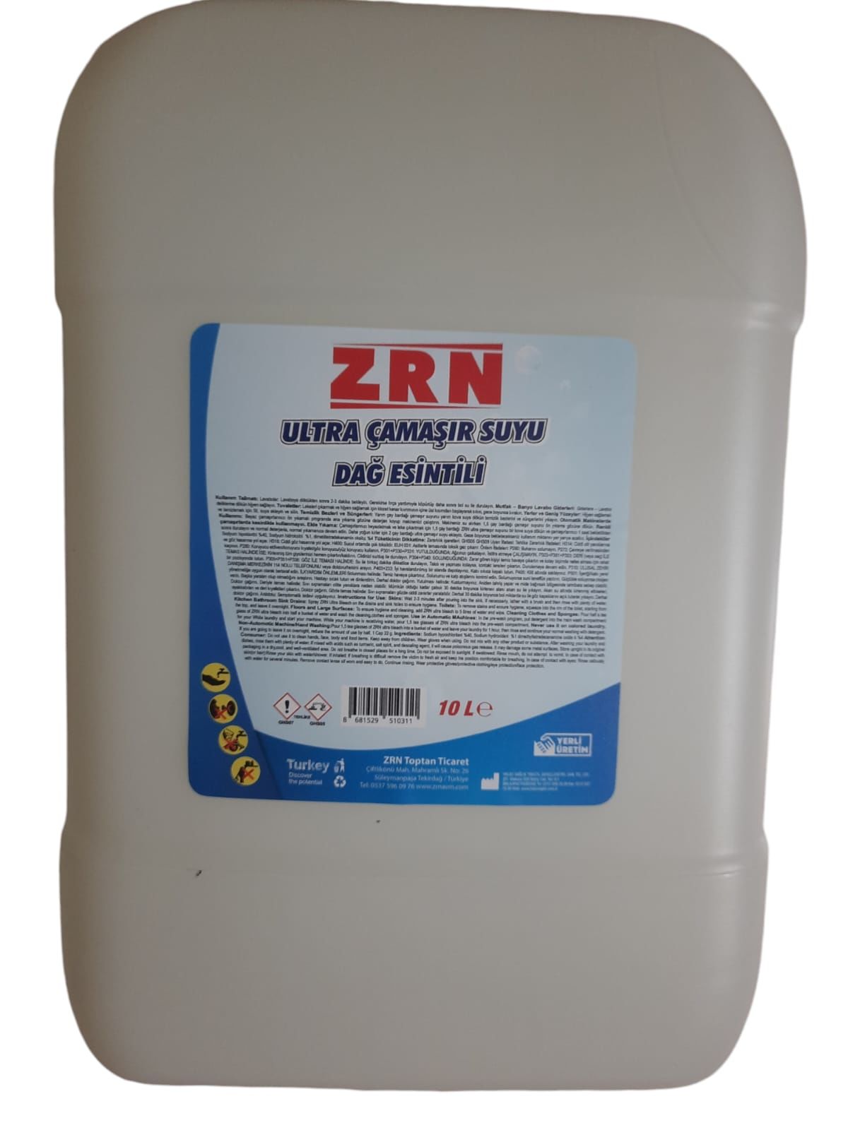 ZRN ultra çamaşır suyu, 10 lt'lik ambalajıyla iş yerlerinin ihtiyaçlarına uygundur. Dağ esintisi kokulu ürün, kullanıldığı ortamlarda ferahlık sağlayarak sıradan çamaşır sularının önüne geçer.